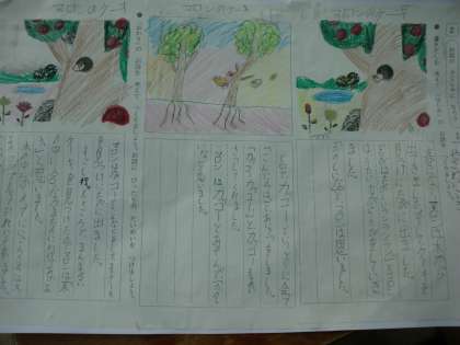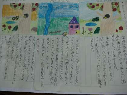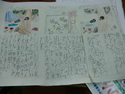 今日の国語では,「お話のさくしゃになろう」の学習で自分のお話をしあげました。子ども達は自分の作り上げたお話を何度か読み直し,流れを確認したり,付け加えたりしながらより世界を広げていました。出来上がったお話は一枚の画用紙にはり,読みやすくしました。