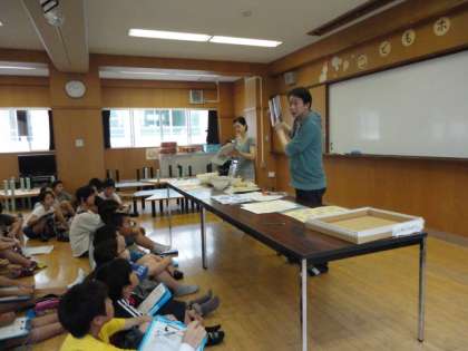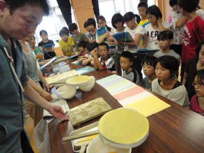 京唐紙の歴史や,桂離宮や二条城の唐紙を唐長さんが制作しているというお話に子どもたちは真剣に聞き入っていました。