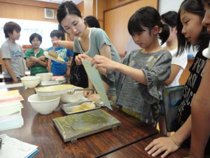 子どもたちは,今まで自分たちがやってきたローラーでインクをつけ,思いっきり手でごしごしこする版画とのちがいに驚いていました。
