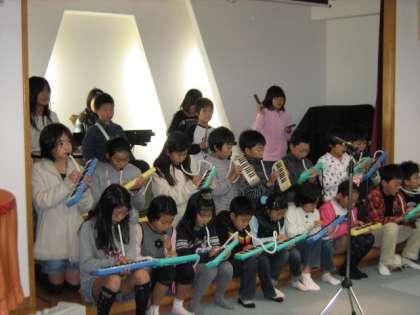 11月15日(日)4年生の希望者23名が,修光祭に参加して「いろんな木の実」を歌唱・演奏しました。これは,交流として毎年4年生が行っているものです。リズムある音楽に踊り出す学園生もいてあっというまに出演は終わりました。おみやげに特製のパンをいただいて子ども達は喜んでいました。