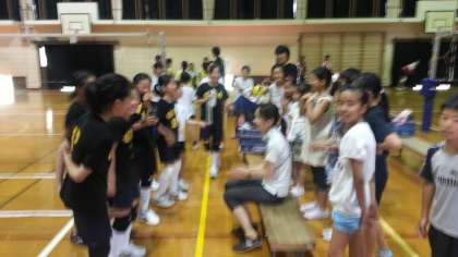 8月5日(月)。修学院体育館に養徳小学校バレー部をむかえ練習試合がありました。5年生の子どもたちもたくさん参加していました。「日頃教室で見るのとはちがう姿を見ることも,お互いの理解を深める」と考え,学習日に参加していた子どもたちと,応援参加しました。「うまいやん。」「おもしろいなあ。」応援の子どもたちも楽しみました。2枚目の写真は,バレー部5年と応援に来た5年生とのあいさつです。夏祭りでは,チア,太鼓で5年生のがんばる姿も見られました。クラス,学年を超えてダイナミックに活躍している子どもの姿。すばらしいです。