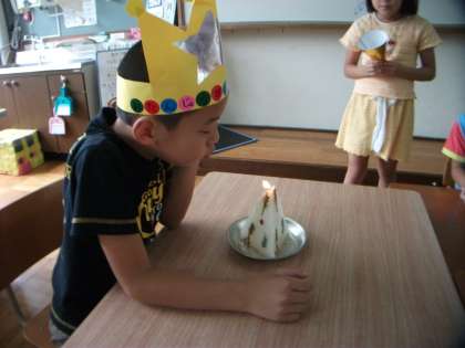クラスの友だちの誕生日会を行いました。ハッピーバースディの歌を歌ってお祝いしました。クッキングは「春巻きチョコパイ」でした。春巻きの皮でチョコレートを巻きマーガリンを塗ってトースターで焼いて出来上がりです。外はパッリとして中はチョコレートでトロッとしていておいしかったです。ゲームは「電車ゲーム」と「だるまさんがころんだ」をしました。皆でお誕生日を祝いし,楽しい時を過ごしました。