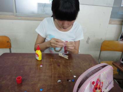 木製のクリップに思い思いにスパンコールやビーズをつけてデザインし,