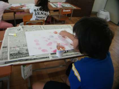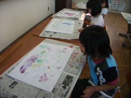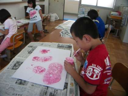図工でシャボン玉液を使って模様を作りました。まずシャボン玉液に絵の具を入れて色を作ります。そこに息を吹き入れて,泡を作り,入れ物からはみ出した泡を画用紙におとして模様を作っていきました。淡い夢の世界が出来上がりました。