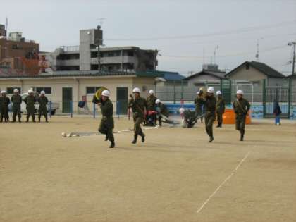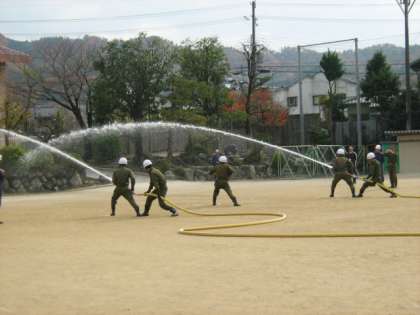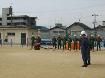 写真は,左京消防分団修学院分団員による「小型動力ポンプ」を用いた放水操作訓練の様子です。命令と共に活動し,活動終了後は次の活動のための準備を行いながら片づけをするなどきびきびとした態度の中で操作が行われました。
