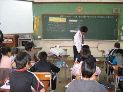 分数の学習を見ていただきました。本時の目標は「2リットルのジュースを3人で分けた時の1人分の量の表し方を分数で考える。」です。