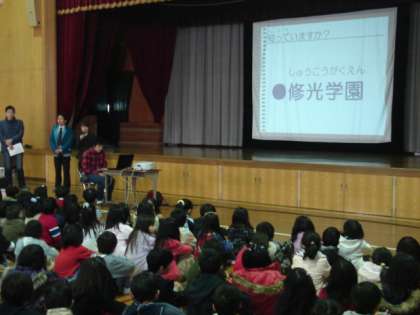 本日、朝会の後、体育館で全校児童が人権学習として修光学園の方の話を聞きました。修光学園は地域にある施設で子どもたちもよく知っています。プレゼンテーションやビデオを使って施設のことや障害について分かりやすく教えていただきました。修光学園のみなさん、ありがとうございました。
