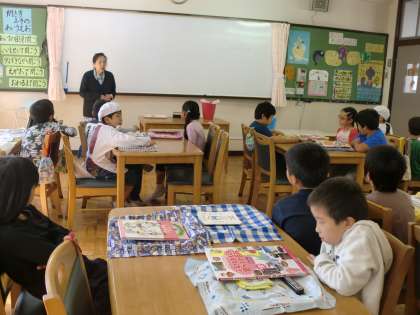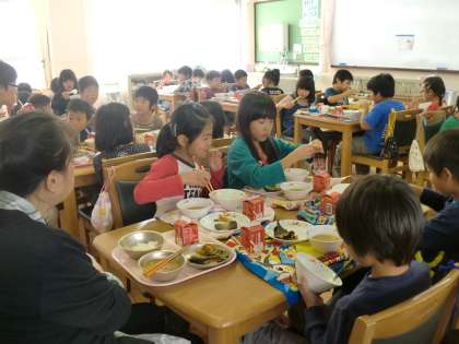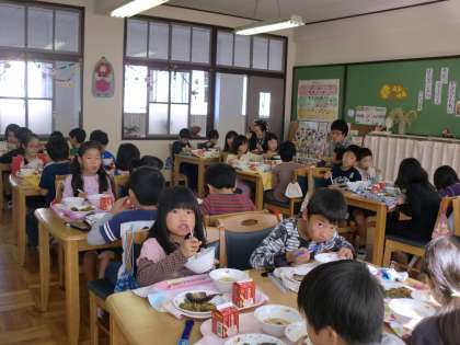 今日から3日間,学級ごとにランチルームで給食を食べます。子ども達はいつも食べている教室とはちがう雰囲気の中で楽しそうに食べていました。ランチルームでは自分でおぼんを持って給食を取りに行ったり,陶器の器で食事をしたりすることで,色々な食事の仕方を学んでいます。