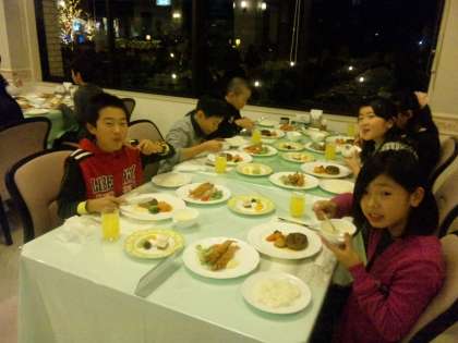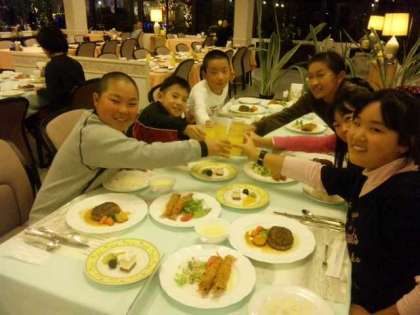 待望の夕食が始まりました。ハンバーグステーキ&ジャンボ海老フライ!豪華な夕食です。みんな大満足。