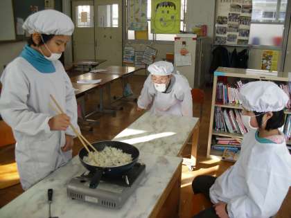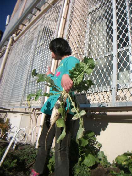 大根を収穫しました。それを使って「バター醤油炒め」を作りました。バターの香りと醤油の香ばしさが,とれたての大根の甘さと良く合い美味しかったです。育てた作物が食べられる楽しさも味わいました。