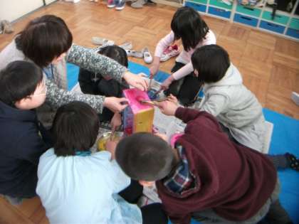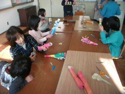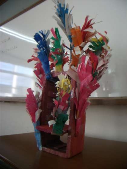 巨匠展にむけて学校作品が出来上がりました。発砲スチロ—ルの箱をトンネルにして,先日色塗りしたかみをクルクル巻いて,切り目を入れ引き出して,サンゴとして貼りました。サンゴのトンネルに見えるでしょうか。