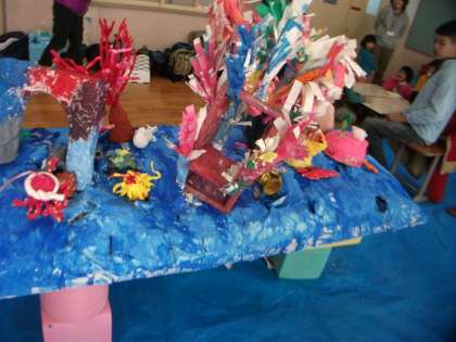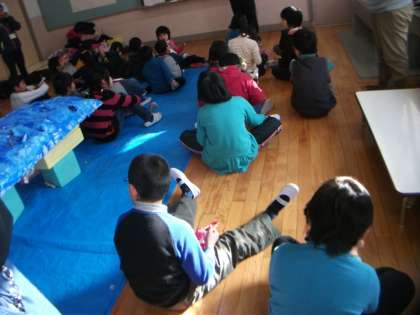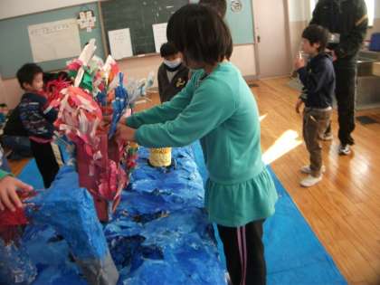 巨匠展にむけて修学院第2小学校に合同作品作りに行ってきました。個人作品の紹介をしてから,学校作品と個人作品を前回の合同作品作りでつくった海に置いて海の世界を作りました。そのあと「海ミッケ」をして支部のお友達と交流しました。