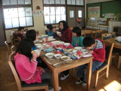 ランチルームで栄養教諭の岸本先生と一緒に給食を食べました。陶器の食器で食も進みました。途中給食調理員さんが来てくださり,「おいしい。」と感想を言いました。最後に岸本先生から「わかさぎ」についてのお話をきき,ランチルームでの給食を終わりました。