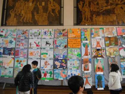 1年生も雪あそびの絵を出展していまし,他学年の作品を鑑賞にいきました。