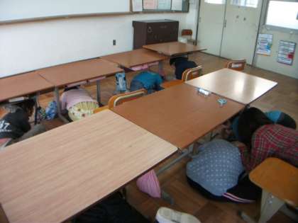 シェイクアウト訓練で,3つの安全行動「姿勢を低くして」「体・頭を守って」「揺れがおさまるまでじっとしている」をとりました。いつ地震が起きるかわかりません。この訓練を通して自分の身を守る方法の1つを身につけて行ってほいしいです。