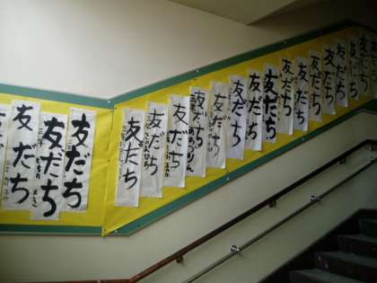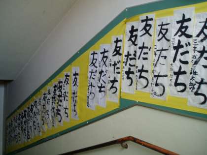 3年生の書き初めは、本館の1階から踊り場〜2階に向かう西階段と2階の廊下に展示しています。26日(火)から29日(金)まで展示しています。