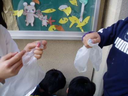 棒磁石をビニル袋に入れて(砂鉄が直接磁石につくととれなくなります。)砂鉄探しです。乾いた砂のところを探して磁石を近づけます。みんな子どもたちは必死です。「砂鉄あったよ。」「ひとつついたよ。」「いっぱいみつかったよ。」とあちこちで歓声を揚げています。学習時間が終わってもなかなかやめられません。