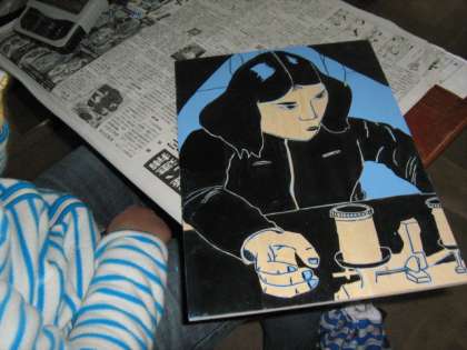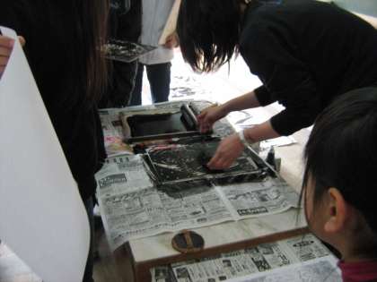 理科の学習の様子を版画にしています。先生も印刷に一苦労です。この時期,先生方の指先が真っ黒になっているのは,このためです。
