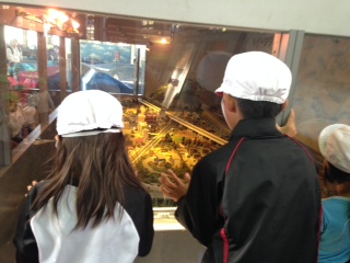 お昼からは,梅小路にある蒸気機関車館でジオラマを見たり,実際に蒸気機関車に乗って,本物に触れているところです。