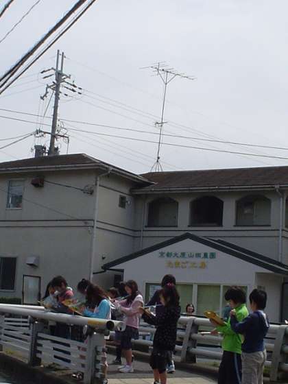 身近な動物を調べに行きました。ツバメの巣を観察していると、ツバメが飛んで来て、電線に止まったので、よく観察することができました。観察カードに「ピチョチョピとかヒチュチュピとか鳴いていました。」「飛ぶのが速くてびっくりしました。」「尾が長くてかっこよくにえました。」と書いていました。