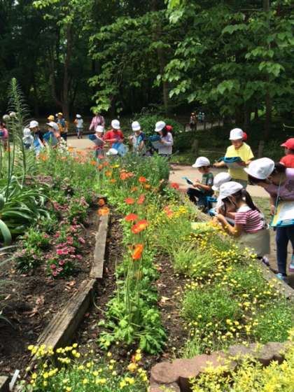 温室で珍しい植物を見て,花壇の植物の絵を描いたよ。