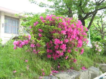 玄関周辺に咲いている花です。ゼラニュウム・ネモフィラ・アメリカンポピー・ビオラ・ディジーなどです。また、築山には、きれいなつつじも咲いています。