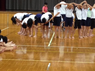 今日は雨。6年生は体育館で練習です。これまでとは少し違う大人数の技(ウェーブ)に取り組みました。4クラスを3つに分け,それぞれのグループでウェーブを練習しました。ゆっくりと動きながら,波の感じを出して,回ります。途中では一息入れながらも,真剣な面持ちで取り組んでいました。回数を重ねる毎に,きれいな動きに変化していきました。
