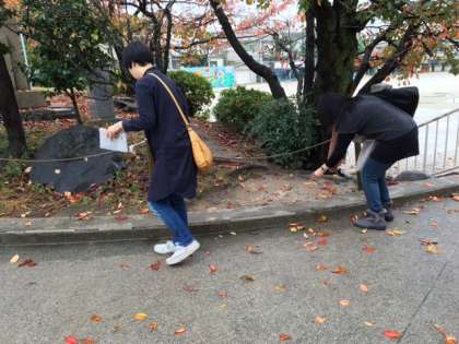 落ち葉は,実は,とても魅力的。色や形の違いを見つけるだけでも親子で楽しめそうです。そんなネイチャーゲームを教えていただきました。