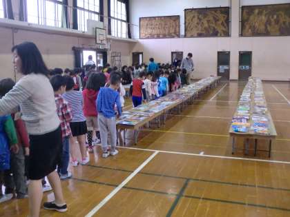 今日,本のリユースフェアがありました。1年生は,好きな本を1冊見つけていました。いろいろな本があったので,どれにしようか迷っていた子もいました。