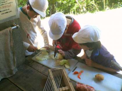 火をおこす係り・野菜を切る係りなど,役割分担して進めます。やけどしないように…,手を切らないように…。出来上がりが楽しみです。きっとおいしいカレーライスができることでしょう。