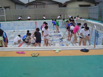 18日に予定していたプール掃除ですが,雨が降ったりやんだりであったために,一部,本日行うことにしました。6年生が昨年の秋からの汚れを落としてくれました。放課後は教職員も掃除をして,水を入れます。明日からは低学年の水なれからプールでの学習も始まります。健康管理をお願いします。