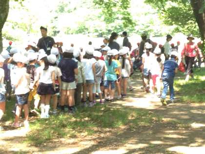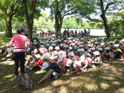 植物園の広場に着きました。これから,オリエンテーリングに向けて,園内探険に出かけます。植物園は,たくさんの小学生でいっぱいです。