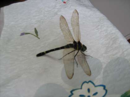 「バサバサ…」妙な音に、窓に目をやるとそこにはオニヤンマ。ちょっぴり小さめのオニヤンマが、どこから入ってきたのか校長室の網戸から外に出ようともがいていました。