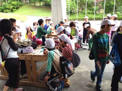 ネイチャービンゴが終了して帰ってきたグループから,ジュースを飲みました。炎天下ではないにしろ,フォークダンスや敷地内探索をして喉はカラカラ…。みんでおいしく飲み干しました。