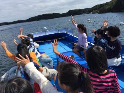 賢島までバスに乗り,そこから「みさきの家」へは,乗船します。2つに分かれ,みさきの家敷地内のなかよし港まで約40分間の乗船です。その間,4グループに分かれ,デッキからの景色を楽しみました。時折,すれ違う船や海上でお仕事中の方々に手を振る光景も見られました。快晴で,とてもすがすがしい乗船となりました。みんな元気。まもなく,なかよし港です。