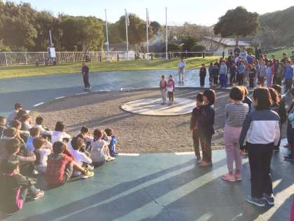 今日も「みさきの家」は,快晴。みんな午前6時に起床しました。シュラフを返却し,シーツをリュックにしまい,7時5分前には,第1営火場に集合しました。そして,同日宿泊の大原野小学校とともに,朝の集いを行いました。お互いの学校紹介をして,それぞれの学校の特色を確かめ合いました。大原野小学校には土俵があり,相撲部もあるそうです。みんなの前で,四股踏みも披露してくれました。