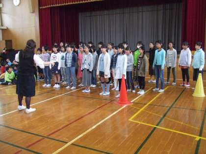 今日は体育館で練習をしました。本番の舞台で並ぶ順序で実際に歌いました。