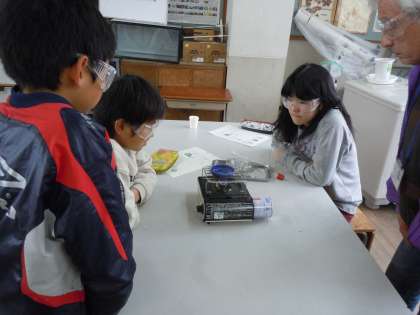 蒸発皿に入れたろ液を熱すると,すぐに水が蒸発して白い粉が出てきました。子どもたちは,「おー!白くなった。」「水の中に溶けていたホウ酸がでてきたんじゃない?」といろいろ考えながら,結果をプリントにまとめていました。氷水につけたろ液は,なかなか変化が表れないので次の時間まで冷やし続けておくことになりました。