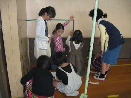 1㎥の大きさを体感するために,体育館にてグループで1㎥を作りました。