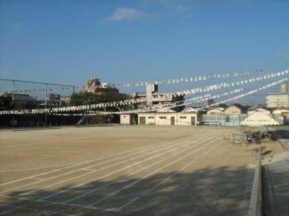 (1)準備が整った運動場。子どもたちが来るのを静かに待ちます。
