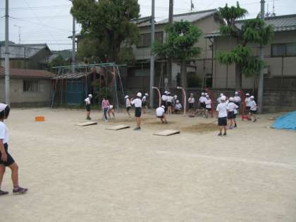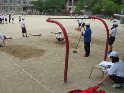 5年生では,リレー学習の次に走り幅跳びの学習を行っています。