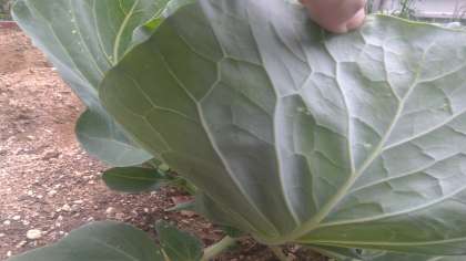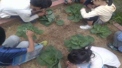 学校の畑に植えてあるキャベツに,モンシロチョウのたまごがくっついています。さっそく理科の学習で観察に行きました。