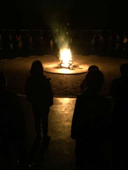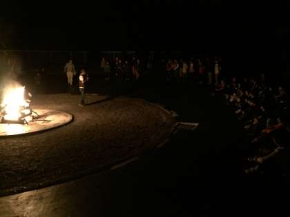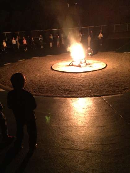 午後7時30分,辺りはすっかり暗くなり,キャンプファイヤーの時間となりました。みんなは既にスタンバイ。あとは,火の神と火の子を待つだけです。その時,4人の火の子を従えて火の神が入場しました。そして,自分を見つめなおす4種類の火(希望の火,努力の火,勇気の火,友情の火)を授かりました。