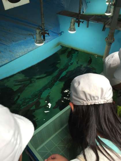 暖かい地方に生息するフンボルトペンギンにふれる「ペンギンタッチ」を体験しました。また、水族館の裏側から、直接えさをやりました。