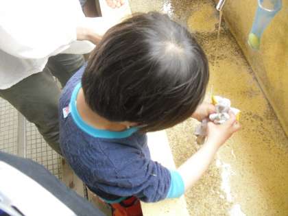使い終わった軍手は,自分で洗って絞ります。