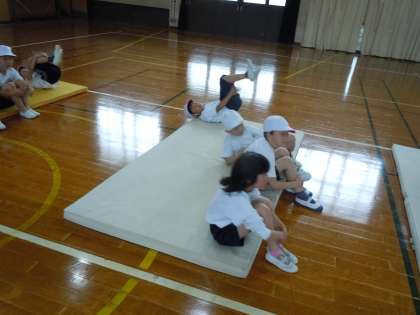 2年生の体育では,「マットあそび」の学習が始まりました。子どもたちは,てきぱきと準備をして練習に取り組んでいます。