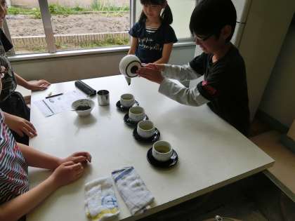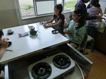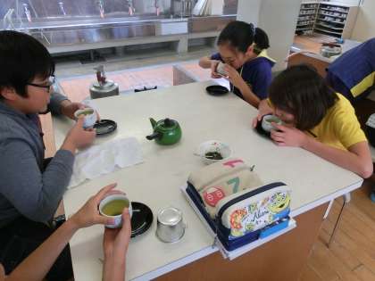 湯のみにお茶を入れ,一段落。自分たちで入れたお茶を味わっています。熱いお茶に苦戦している様子も。きゅうすの扱い方がとてもキレイです。