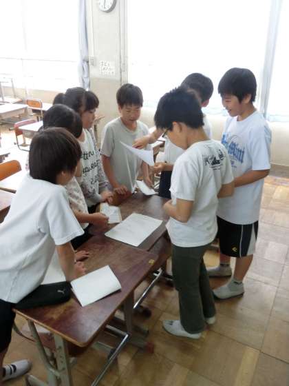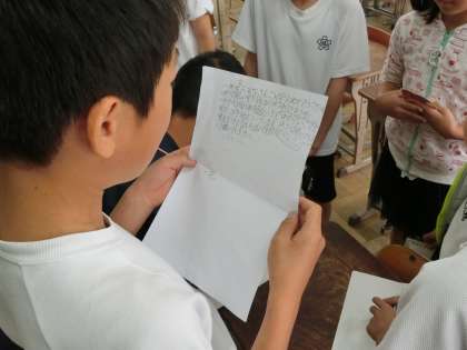 1年生を迎える会の5年生の発表では,歌の前にそれぞれの学級の代表委員が一年生に向けて言葉を伝えることになっています。どんな言葉を一年生に伝えるのか,代表委員一人一人が台本を考え,8人で持ち寄って,話し合いを通して,一つの台本を作りました。1年生を迎える会は,いよいよ来週です。