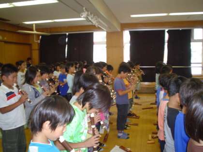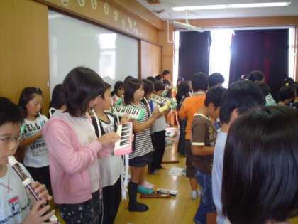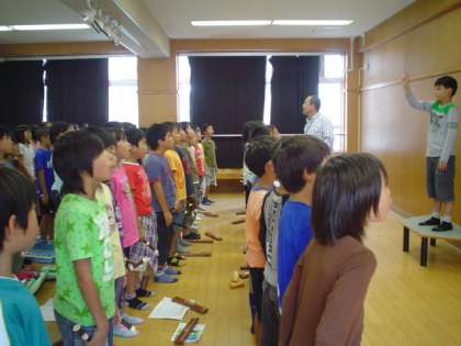 支部学童音楽会に向けて学年全体の練習が始まりました。各クラスで練習してきたのを合わせて演奏しました。運動会で4年生が協力して練習してきたことがすばらしい発表になったように、音楽会でもすてきなハーモニーを披露してくれることと思います。「こきりこぶし」と「茶色の小びん」を演奏します。