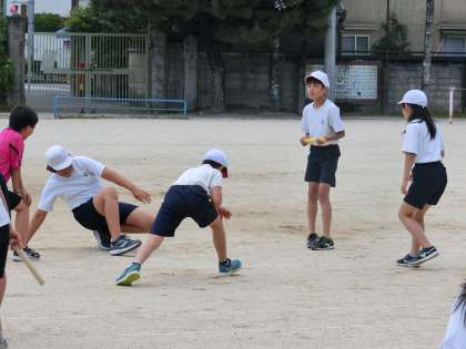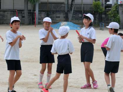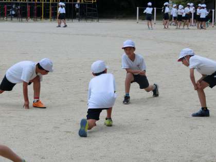さあ,いよいよ学級対抗リレーが始まります。準備運動を開始して,ウォーミングアップしています。どこの組が優勝するのでしょうか。